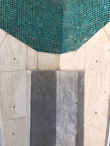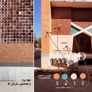 مود بورد MOOD BOARD متریال های به کار رفته آنطور که گفته شد، جشنواره‌ای یکپارچه از رنگ و تکثر متریال است. آجرهای قرمز-قهوه ای در جداره‌ها، در کنار کاشی‌های قهوه‌ای تیره در طیف تنالیته‌ی رنگ آجرهای مجاور، ترکیب شده با سنگ‌های سفید تراورتن، و در نهایت رنگ سبز آبی بعنوان نگین و نقطه عطف مود بورد به زیباترین شکل ممکن در کنار یکدیگر قرار گرفته‌اند. اساساً نمای جبهه‌ی اصلی یک سیمای معمارانه‌ی بسیار شاخص است که به طرزی هوشمندانه در ادغام و ارتباط با فضای شهری است.