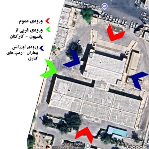 سیرکولاسیون و جهت‌یابی در فضای عملکردی بیمارستان به طرق زیر در محدوده بنا حل شده‌اند: