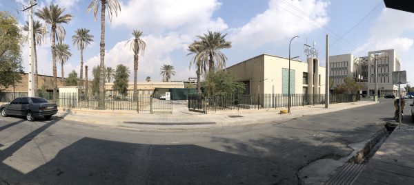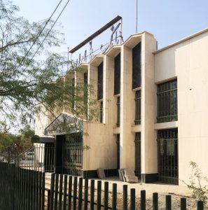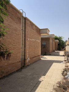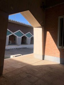 رواق‌های سراسری به شکل عناصر منسجم در جبهه‌های مختلف به صفحه‌هایی با پوشش آجر و سیمان شسته ختم می‌شوند و از لحاظ تجسمی یک قاب بصری با شکوه شکل می‌گیرد و از نظر عملکردی نورهای شرقی-غربی را برای ورود به ساختمان کنترل می‌کنند.