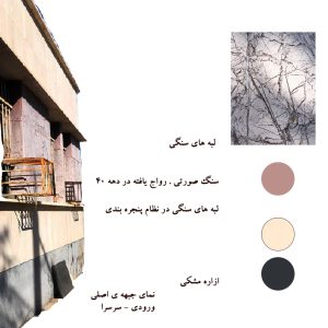پالت و تنوع رنگی نمای اصلی با توجه به نمای سنگی قابل ذکر است. سنگ مشکی در ازاره و تراورتن سفید در ابعاد هماهنگ بر روی بدنه، سنگ مرمر صورتی و رگه‌دار در حد فواصل پنجره‌ها با لبه‌های ضخیم آستانه در زیر و بالای نظام پنجره‌بندی خطی افقی و تجسمی را در نمای اصلی ایجاد کرده است که یادآور طرح‌های محسن فروغی است.