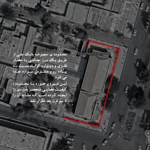 عدم استمرار طرح نما با توجه به تغییر نوع و کیفیت متریال، به نوعی نگاه غیر منسجم اشاره دارد و گویای شرایط ساخت در آن تاریخ بخصوص است. حصارهای فلزی سبز رنگ و دور تا دور مرز سایت پلان، محدوده‌ی فضایی بانک را تعریف می‌کنند و در یک ترکیب چیدمانی ورودی اصلی بانک را سازماندهی می‌کنند. محدوده‌ی بانک از طریق این مرز حداقلی با حصار فلزی با ارتفاع کم نسبت متفاوتی با منطقه پیاده و سواره ایجاد می‌کند، این شیوه برخورد با محدوده کیفیت فضایی منحصر بفردی را ایجاد کرده است که مشابه آن را تا نیم قرن بعد نزد طراحان بومی تکرار نشد.